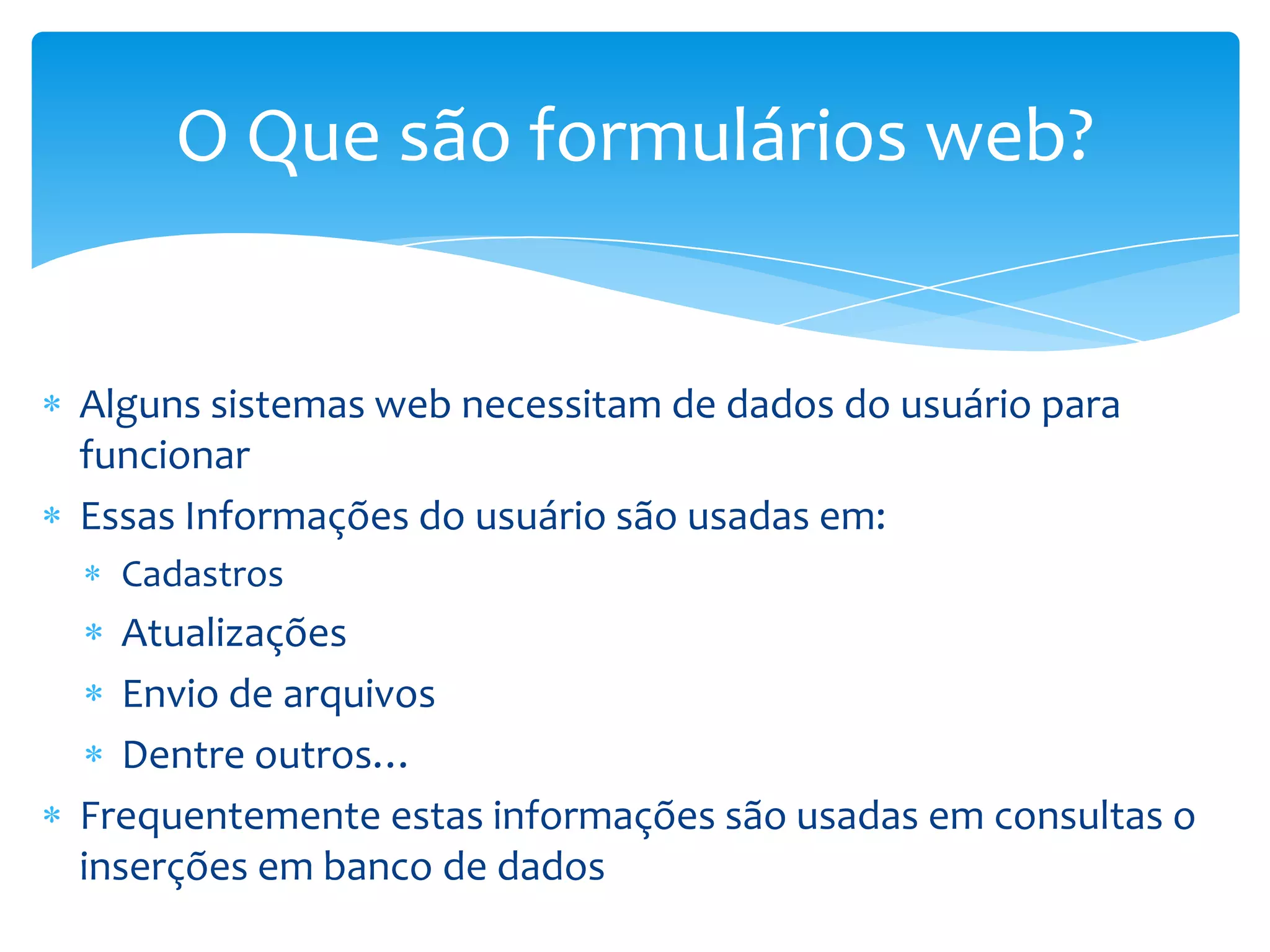 O documento discute sobre formulários web, métodos de envio de dados para servidores, e manipulação de informações de formulários com PHP. Inclui sessões e cookies para armazenar dados do usuário entre requisições.