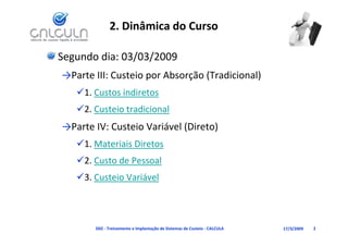 2. Inclui objetivos de aprendizagem, conceitos gerais, esquemas de contabilidade de custos e bases comuns para rateio de custos indiretos, como unidades produzidas, horas de mão-de-obra direta e horas de máquina.