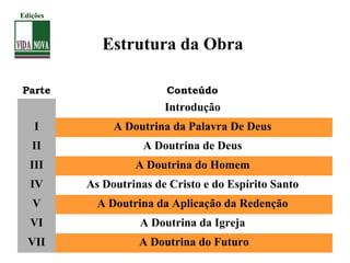 O documento descreve a obra de Wayne Grudem sobre teologia sistemática, estruturada em sete partes que cobrem diversas doutrinas cristãs. Uma seção trata da doutrina de Cristo e do Espírito Santo, explicando que Jesus era plenamente Deus e homem em uma só pessoa. Outra parte discute a natureza humana e divina de Cristo, afirmando que Ele permaneceu divino ao assumir a humanidade.