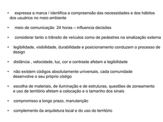 O documento discute conceitos e fundamentos da sinalização ambiental, incluindo como ela expressa a identidade de marca, influencia decisões e considera tanto trânsito de veículos quanto pedestres. Fatores como legibilidade, visibilidade, distância e contraste afetam o design de sinalização.