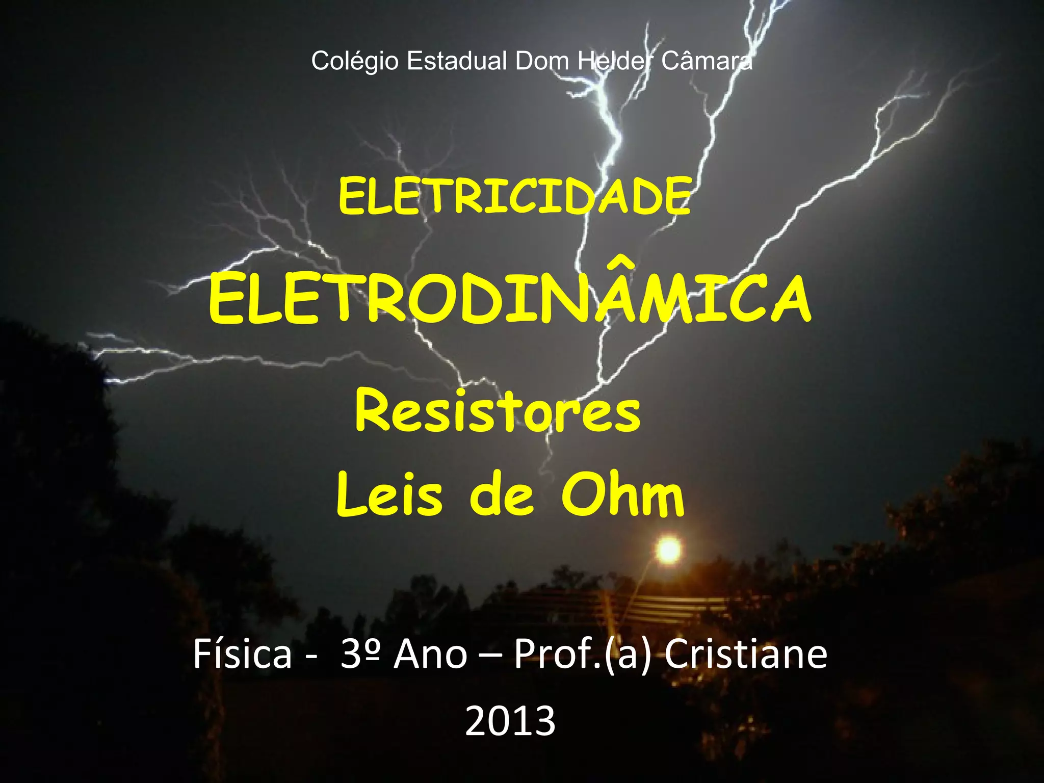 O documento discute resistores elétricos e a Primeira Lei de Ohm. Explica que resistores transformam energia elétrica em calor e são representados por símbolos. A resistência elétrica de um resistor mede a oposição à passagem de corrente e quanto maior a resistência, menor a corrente. A Primeira Lei de Ohm estabelece que a corrente é diretamente proporcional à diferença de potencial para um resistor a uma temperatura constante. Exemplos de cálculos com a lei de Ohm são fornec