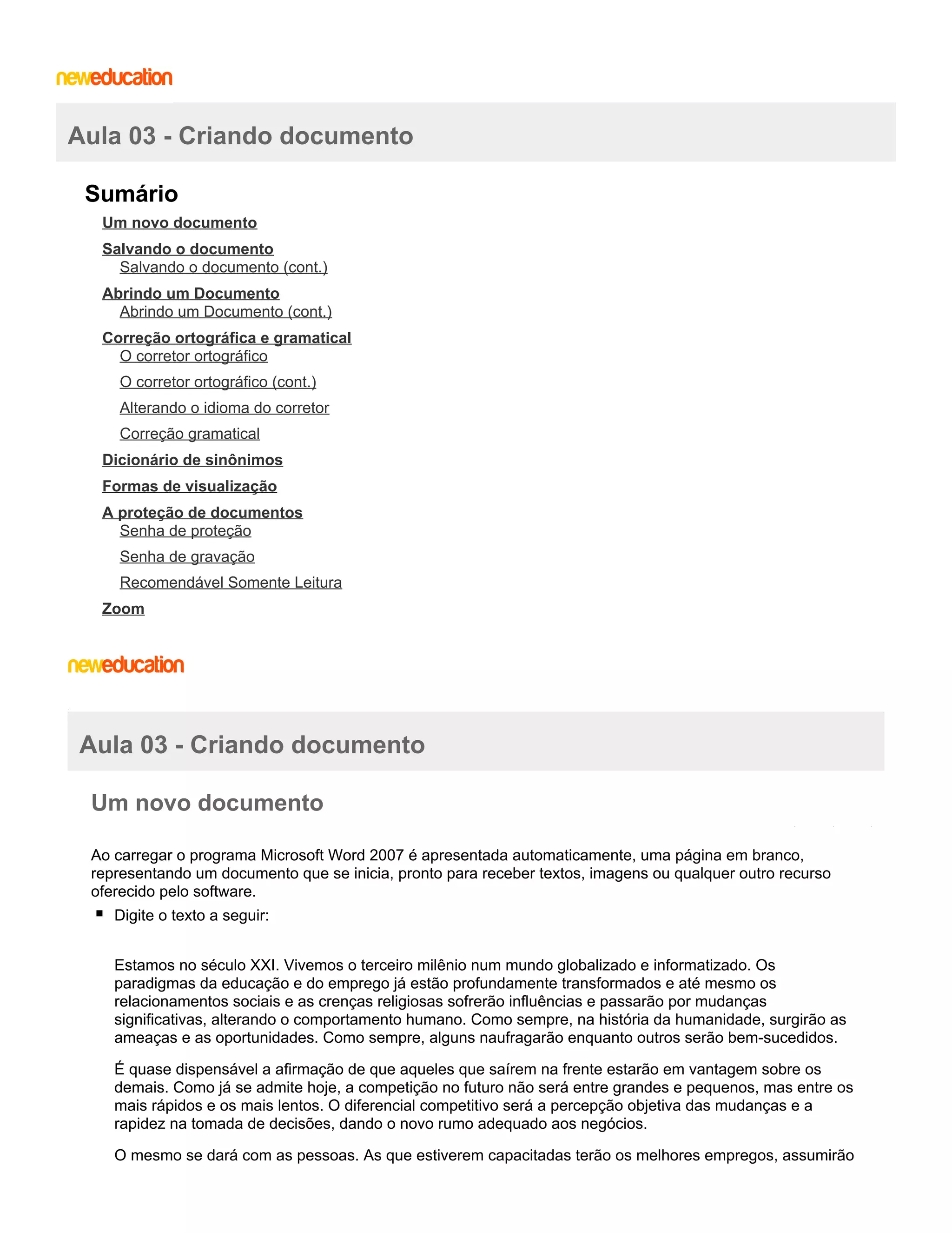 Este documento fornece instruções sobre como criar e editar documentos no Microsoft Word 2007. Ensina como iniciar um novo documento, salvar arquivos, abrir arquivos existentes, usar o corretor ortográfico e gramatical, e alterar configurações como o idioma do corretor.