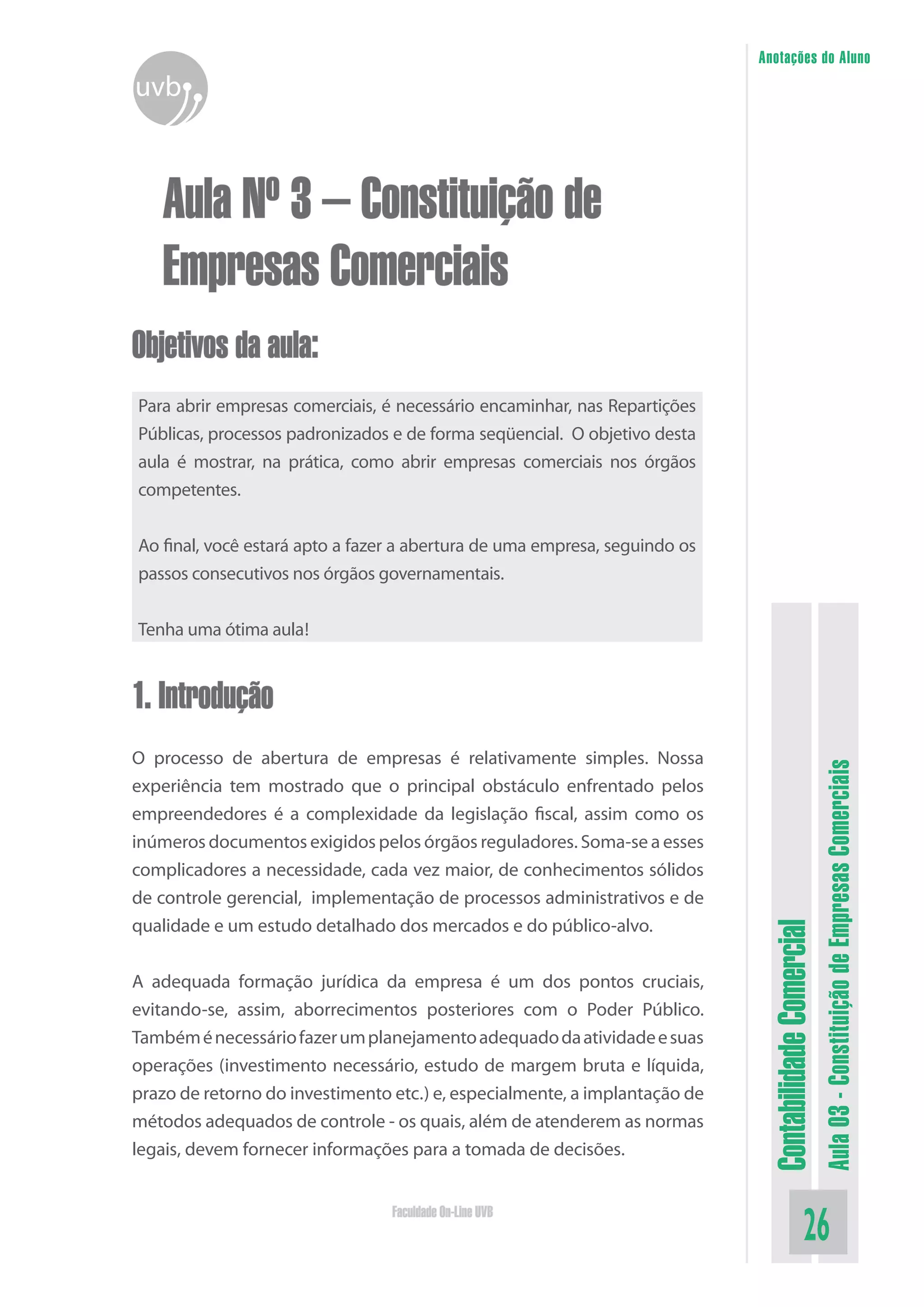 O documento fornece instruções sobre como abrir uma empresa comercial, incluindo os processos necessários junto aos órgãos governamentais competentes. É explicado que é preciso seguir uma ordem sequencial de processos na Junta Comercial, Receita Federal, Secretaria Estadual da Fazenda e Prefeitura Municipal, apresentando diversos documentos em cada etapa. Ao final, são listadas as juntas comerciais dos estados brasileiros para consultas sobre procedimentos específicos.