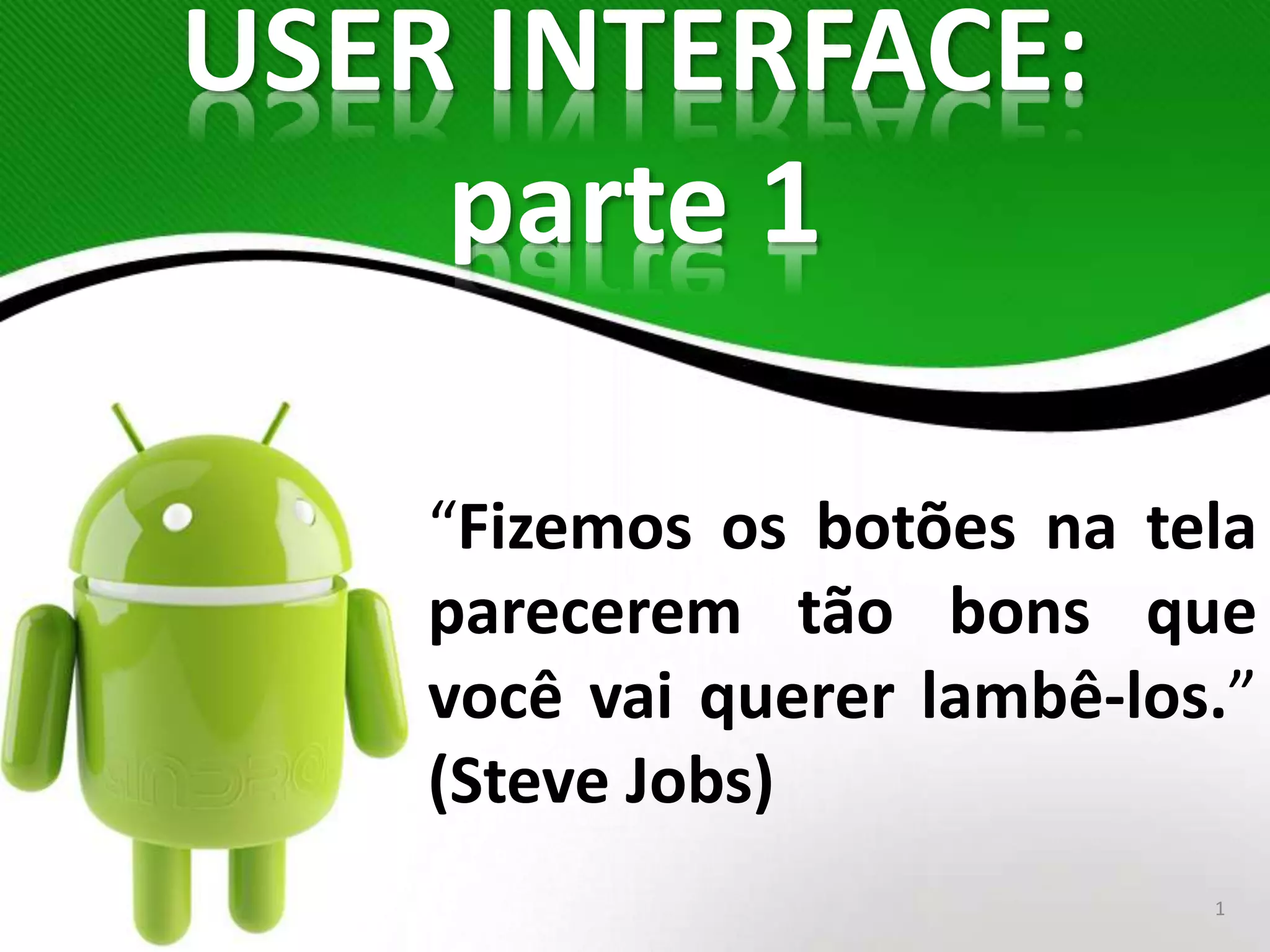 O documento discute interfaces de usuário no Android, abordando os seguintes tópicos: layouts, views como spinner e pickers, caixas de diálogo e menus. Layouts organizam a interface visual e podem ser construídos visualmente ou por XML. Views como spinner e pickers permitem seleção de itens. Caixas de diálogo exibem informações sobrepostas à tela atual. Menus fornecem ações globais e contextuais.