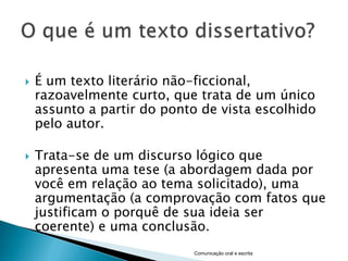Este documento fornece instruções sobre como escolher um tema e desenvolver uma tese principal para um texto dissertativo. Explica que o texto deve ter uma introdução, desenvolvimento e conclusão. Ensina a transformar o tema em uma pergunta e, a partir daí, formular uma tese concisa que será defendida no texto.