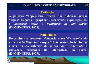 O documento discute conceitos básicos de topografia, incluindo a definição de topografia como a descrição exata e minuciosa de uma porção da superfície terrestre. Aborda também os conceitos de planimetria, altimetria e plani-altimetria e o uso de instrumentos topográficos como teodolitos, estações totais e trenas.