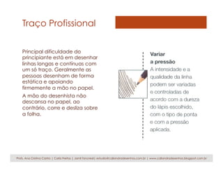 O documento discute técnicas de desenho profissional, incluindo traços, esboços e desenho automático. Ele fornece exercícios para treinar diferentes tipos de traços e sombras através da prática de desenhos de vasos, rostos e gradações tonais.