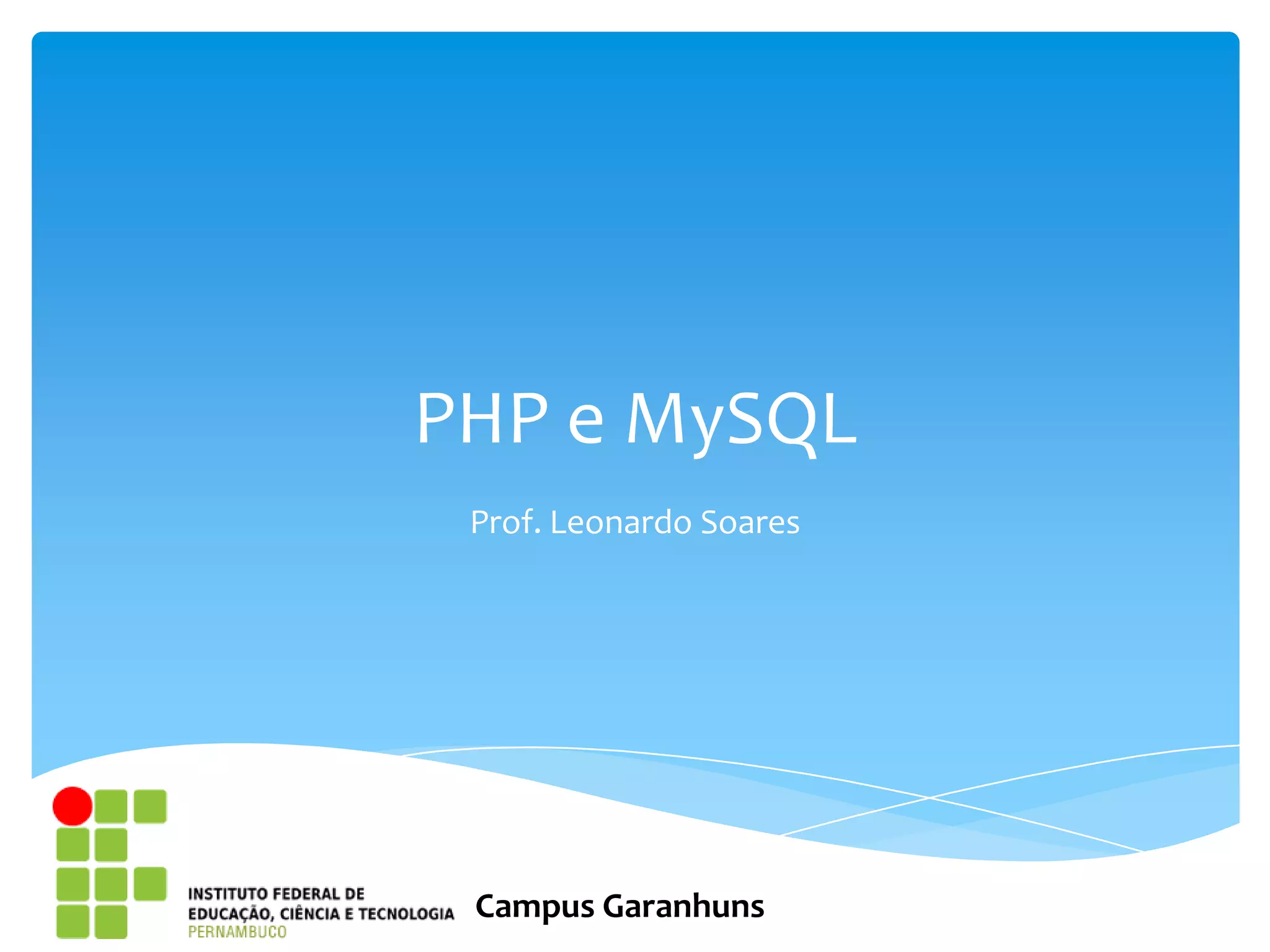 O documento discute PHP e MySQL, explicando que aplicações precisam salvar informações em bancos de dados e que PHP oferece suporte nativo ao MySQL. Ele também fornece instruções sobre como configurar o PHP para usar MySQL, criar bancos de dados no MySQL usando PHPMyAdmin e realizar operações básicas como inserção, consulta, atualização e remoção de dados usando funções PHP.