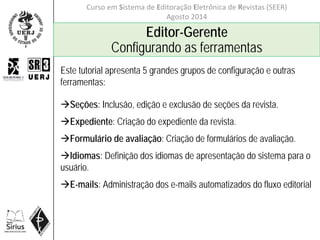 Este documento apresenta as principais ferramentas de configuração do sistema SEER para editoração eletrônica de revistas, incluindo: 1) seções, para criar e editar as seções da revista; 2) expediente, para definir a equipe editorial; e 3) formulários de avaliação, para criar questionários para avaliadores. A configuração dessas ferramentas é essencial para personalizar o sistema de acordo com a estrutura e fluxo editorial da revista.