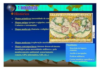 O documento fornece informações sobre fundamentos de cartografia básica, incluindo a história dos mapas, as diferenças entre planta, carta e mapa, áreas afins como geodésia e topografia, a representação da Terra em esfera, elipsóide e geóide, e o conceito de datum geodésico.