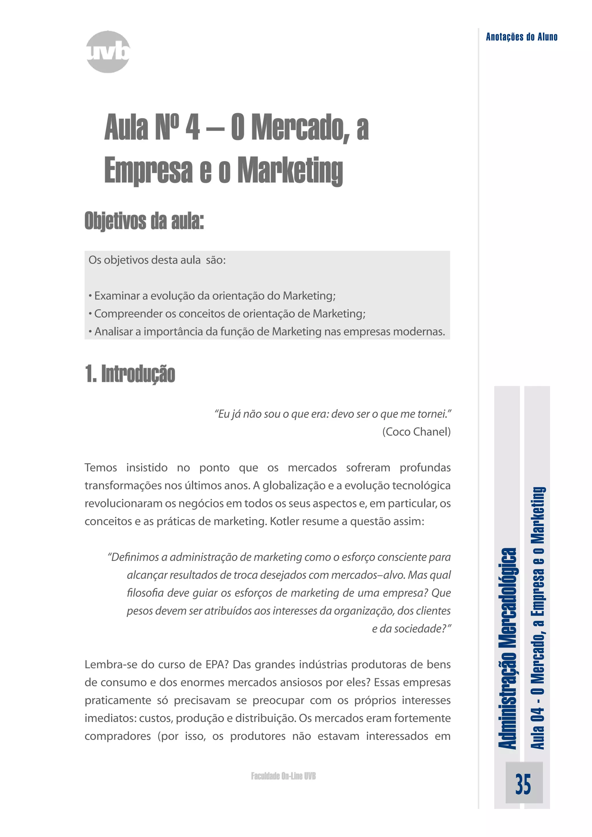 Este documento resume a evolução da orientação do marketing nas empresas. Inicialmente, as empresas tinham orientação de produção ou produto e se concentravam em eficiência e qualidade. Com o aumento do poder dos consumidores, a orientação de marketing tornou-se essencial, focando na criação de valor para os clientes-alvo de forma melhor do que a concorrência. Isso levou o marketing a assumir um papel central nas empresas modernas.