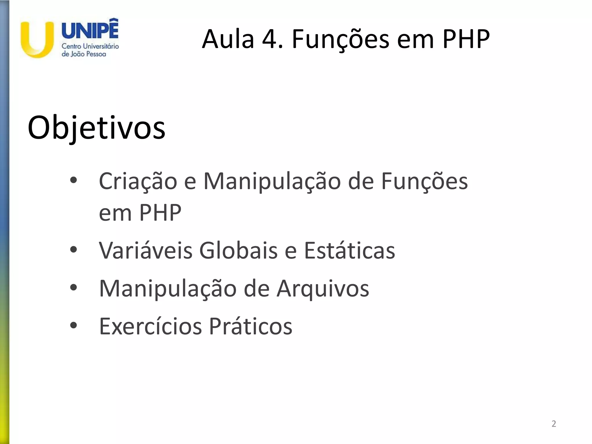 O documento discute funções em PHP, incluindo a criação e manipulação de funções, variáveis globais e estáticas, e manipulação de arquivos. Exemplos demonstram como criar funções, usar variáveis globais e estáticas, e funções para ler, escrever e manipular arquivos em PHP. Exercícios práticos são fornecidos para reforçar os conceitos.