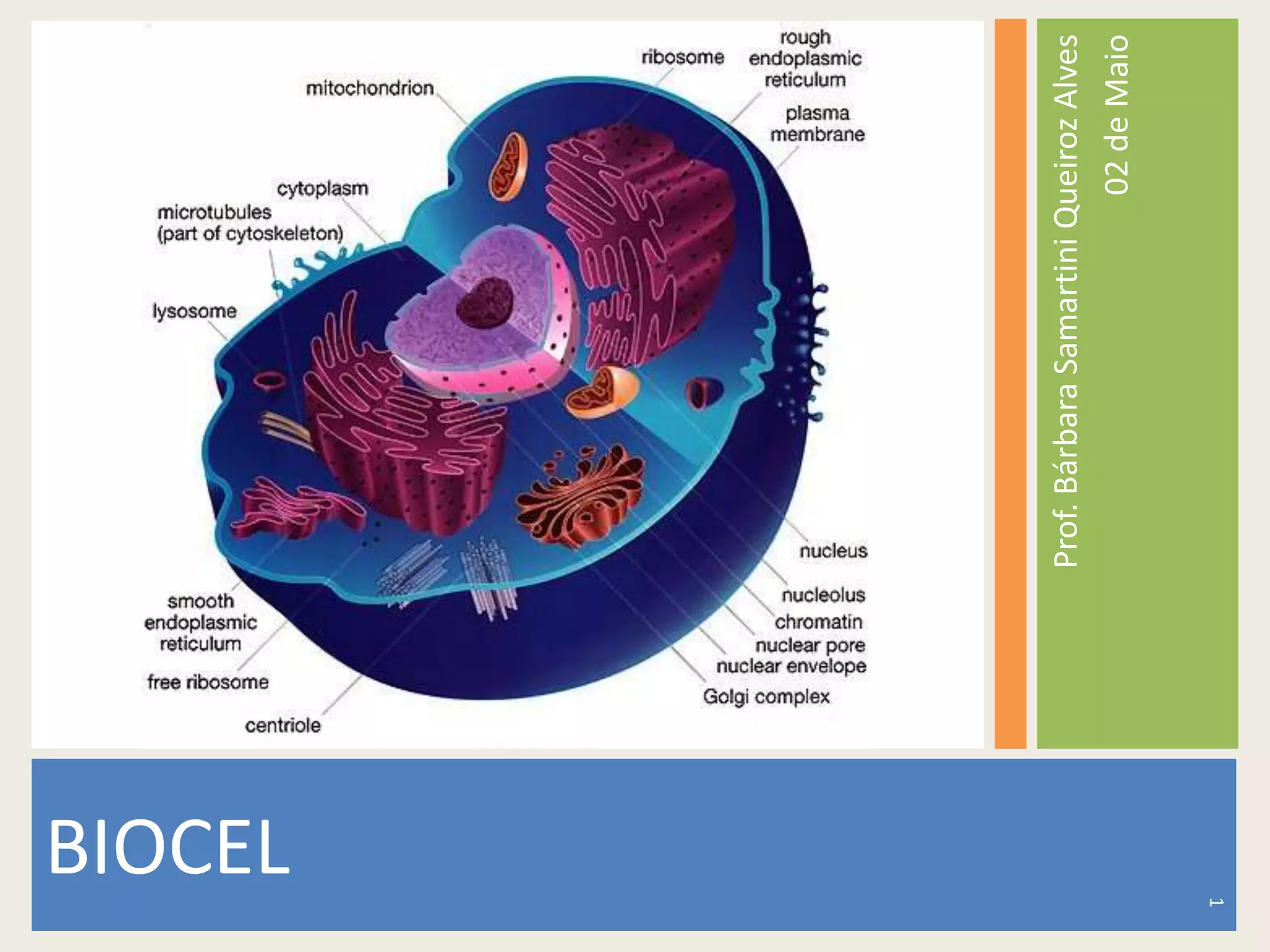 O documento descreve as principais organelas e estruturas de uma célula eucariota animal, comparando-a com células vegetais e procariotas. Primeiro, discute a membrana celular, núcleo, retículo endoplasmático e aparelho de Golgi. Em seguida, fala sobre mitocôndrias, produção de ATP e diferenças entre células animais e vegetais. Por fim, fornece exercícios sobre o assunto.