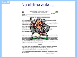 O documento resume os principais tópicos discutidos em uma aula sobre tecnologia dos processos de manufatura, incluindo: 1) processamento de metais, cerâmicas e polímeros; 2) fundamentos da fundição de metais como aquecimento até a fase líquida e escoamento através da gravidade; 3) outros processos como conformação e processos avançados.