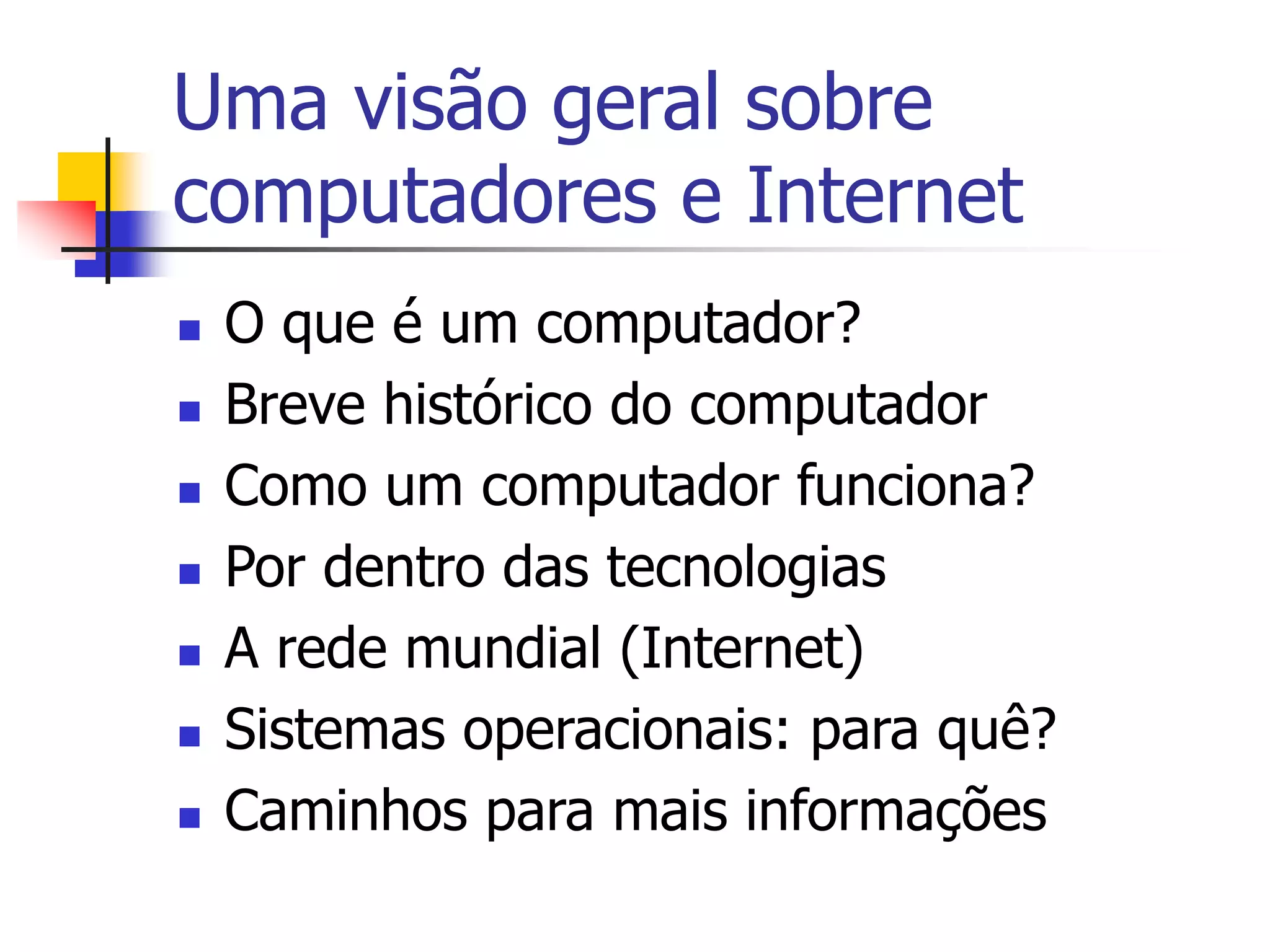 O documento fornece uma visão geral sobre computadores e Internet, discutindo o que é um computador, seu breve histórico, como funciona, tecnologias internas como bus e memória, a Internet e sistemas operacionais.