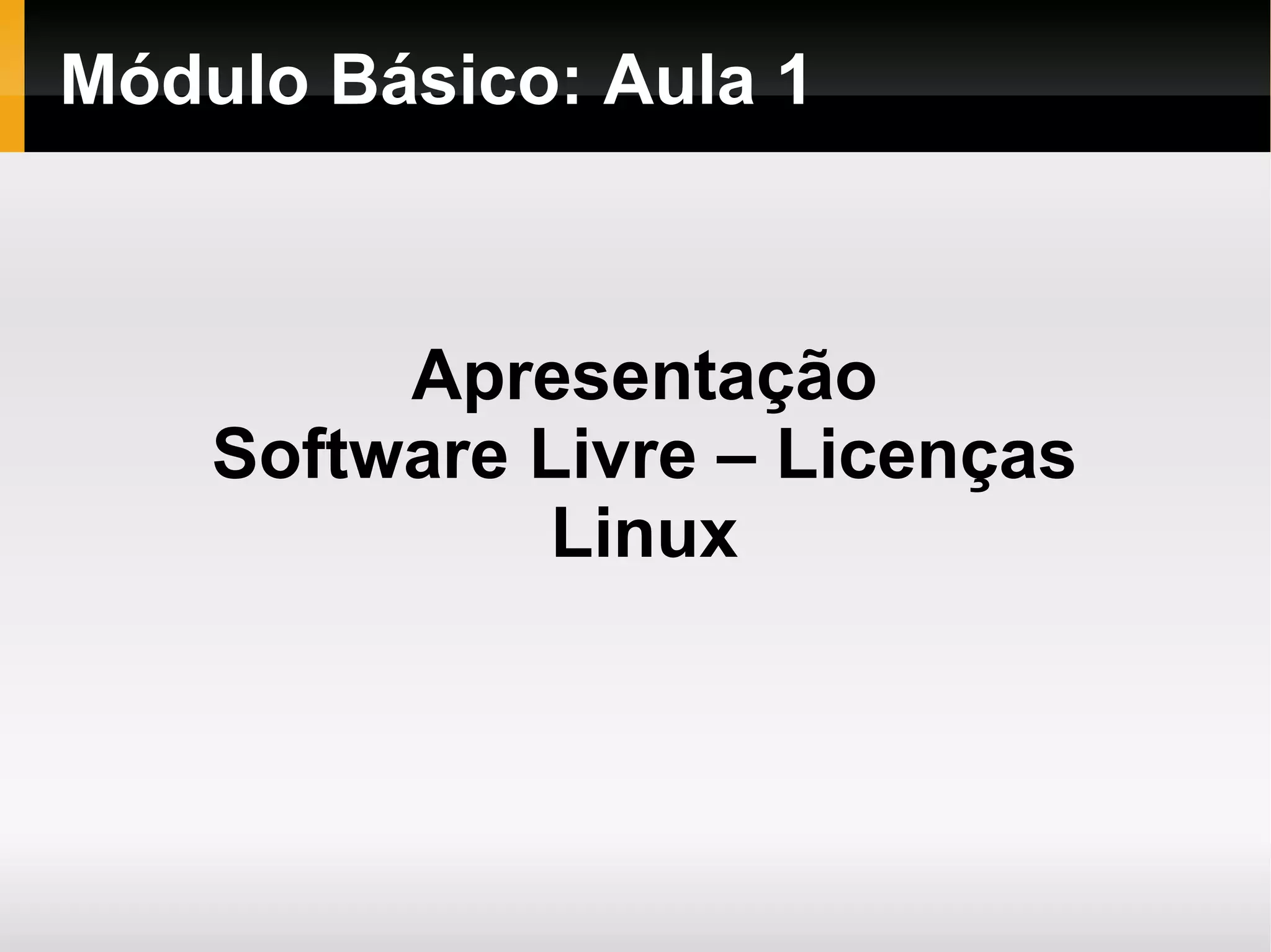 O documento apresenta uma introdução ao software livre, discutindo seu conceito, história, licenças e exemplos como o Linux. Aborda as quatro liberdades do software livre, diferentes tipos de licenças como GPL, BSD e Creative Commons, e o surgimento e características do sistema operacional Linux.