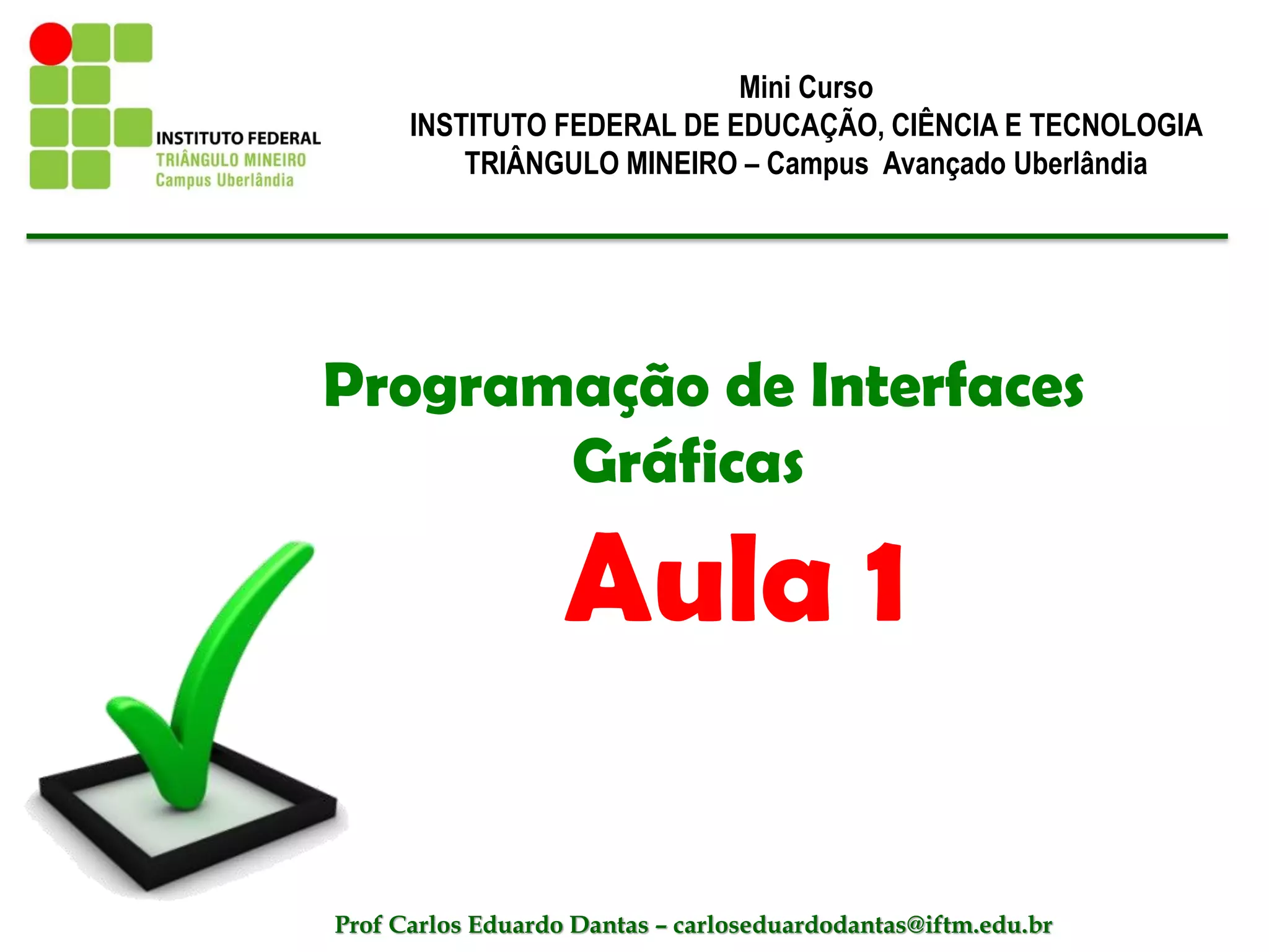 Este documento apresenta um mini curso sobre programação de interfaces gráficas com Swing. Ele discute a criação de um projeto em NetBeans usando o padrão MVC e vinculação de componentes com Beans Binding. O documento também fornece uma visão geral dos principais componentes Swing e do framework.