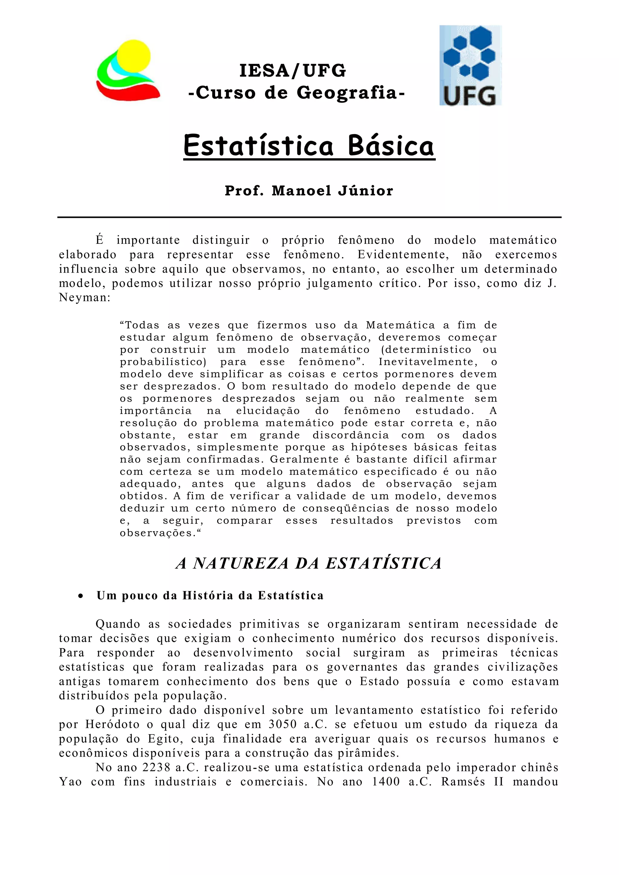 1) O documento discute os conceitos fundamentais da estatística, incluindo a distinção entre fenômenos e modelos matemáticos, a história da estatística e as definições de termos como população, amostra e parâmetros.