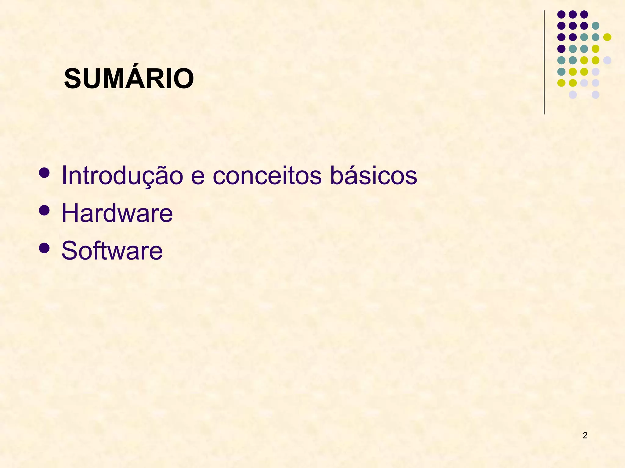 Apresenta os principais componentes de hardware de um computador, incluindo o sistema central, periféricos e tipos de memória
