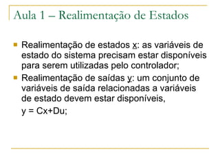 O documento discute realimentação de estados em sistemas de controle. Apresenta como reposicionar os pólos da malha fechada alterando o ganho K e como isso pode afetar a observabilidade do sistema, criando ou destruindo esta propriedade. Também fornece a fórmula de Ackermann para calcular K e exemplos no MatLab ilustrando os conceitos.