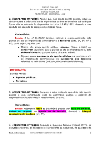 Este documento apresenta 15 questões comentadas sobre a Lei de Improbidade Administrativa. Os principais pontos abordados são: 1) os sujeitos passivos e ativos da lei; 2) a prescrição das ações de improbidade; 3) a vedação de transação ou conciliação em ações de improbidade.