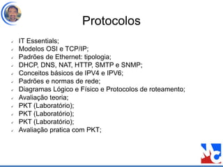 O documento descreve os principais protocolos de rede, incluindo os modelos OSI e TCP/IP, protocolos como DHCP, DNS, NAT, HTTP, SMTP, SNMP e conceitos de IPV4 e IPV6. Ele também discute os protocolos nas camadas de aplicação, transporte e rede do modelo OSI.