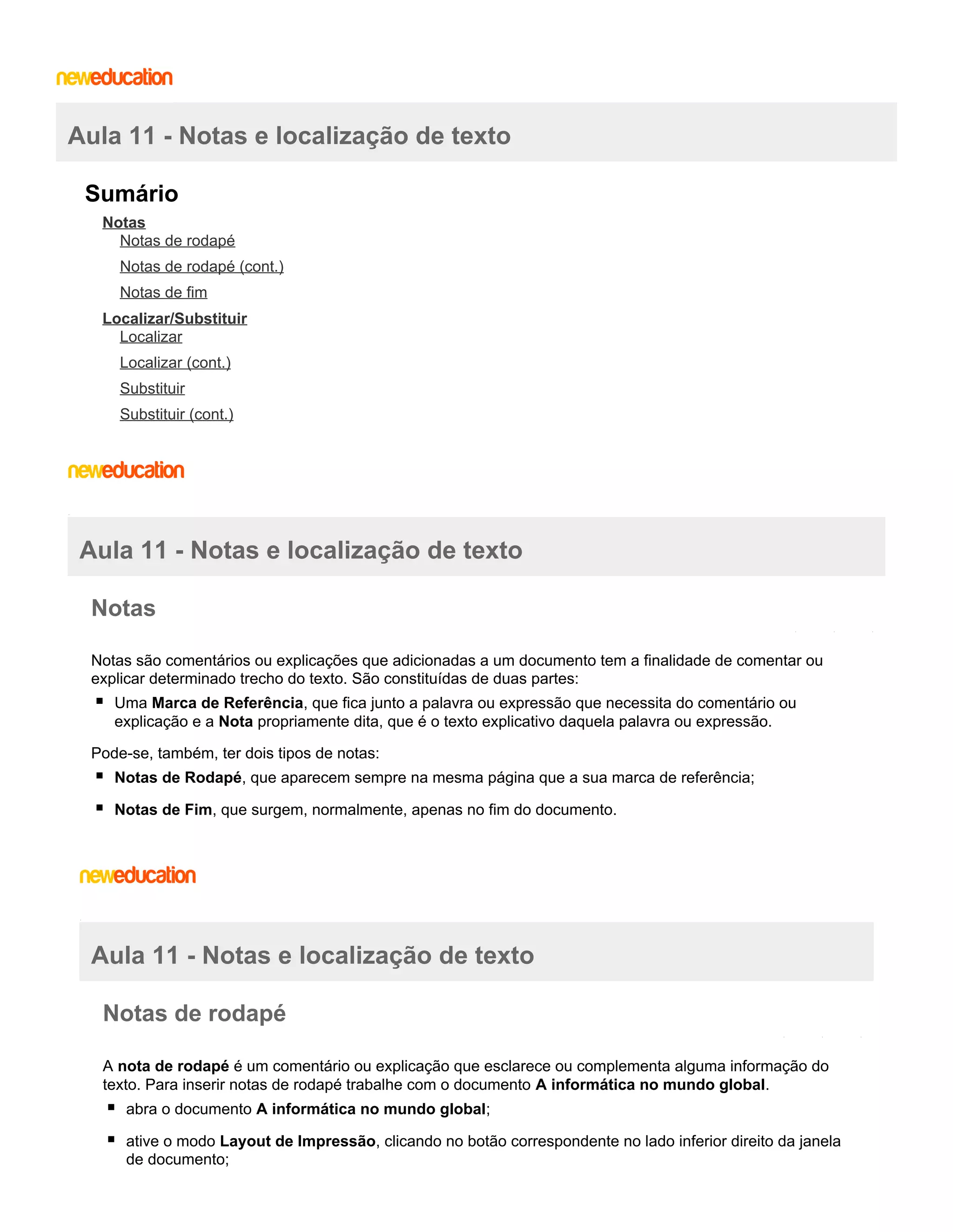 [1] O documento discute notas e localização de texto em documentos, incluindo como inserir notas de rodapé e fim, e usar as ferramentas Localizar e Substituir. [2] Inclui instruções passo-a-passo para adicionar, alterar e remover notas, e localizar e substituir texto ou formatação. [3] Também explica como usar caracteres coringa para localizações flexíveis.