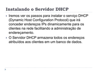 Este documento fornece instruções passo a passo para instalar e configurar o serviço DHCP no Windows Server 2008. Ele explica como adicionar o papel do servidor DHCP, configurar escopos de endereçamento IP, opções de DNS e IPv6, e autorizar o servidor no Active Directory.