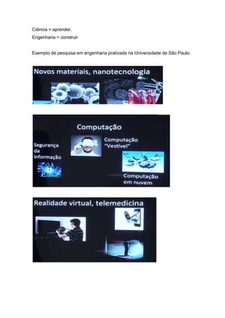 O documento discute a diferença entre ciência e engenharia, com a ciência se preocupando em entender fenômenos da natureza e as leis do universo, e a engenharia se baseando na ciência para criar coisas. A pesquisa ajuda no avanço da engenharia e do conhecimento, seguindo os passos do método científico de questão, hipótese, experimentos, resultados e conclusões. Um exemplo de pesquisa em engenharia é a iniciação científica na USP, que oferece um ambiente