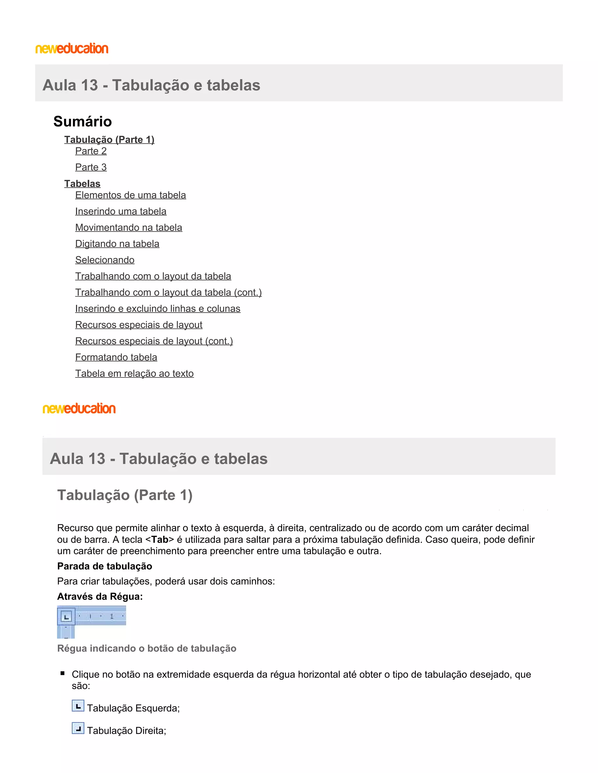 O documento fornece instruções sobre tabulação e tabelas no Word. Ele explica como criar tabulações, inserir e formatar tabelas, mover-se dentro de tabelas, selecionar partes de tabelas e alterar o layout de tabelas, incluindo redimensionar linhas e colunas.