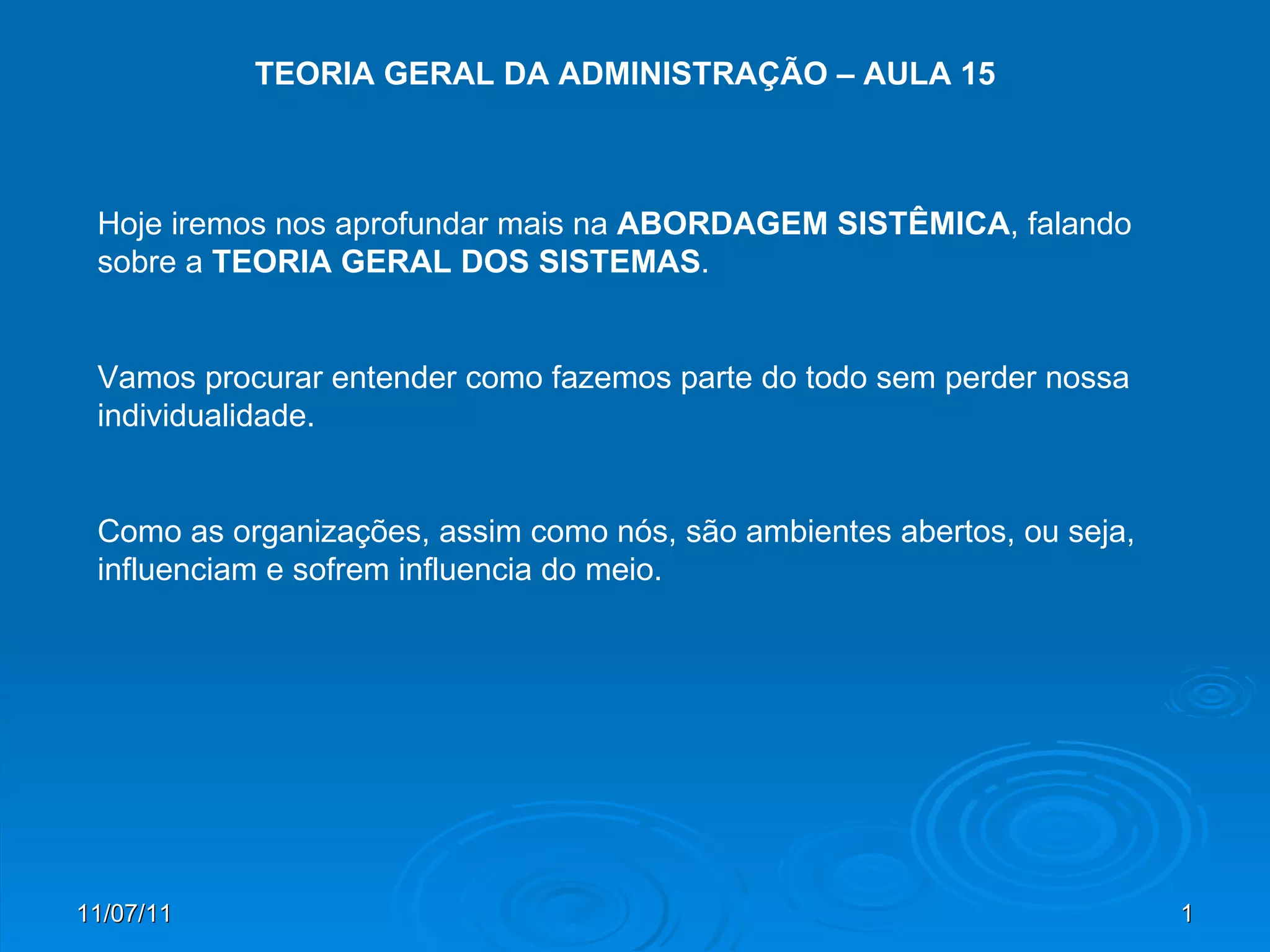 1) A Teoria Geral dos Sistemas surgiu com o biólogo alemão Ludwig Von Bertalanffy e propõe uma visão geral e integrada da natureza em oposição à divisão em áreas distintas.