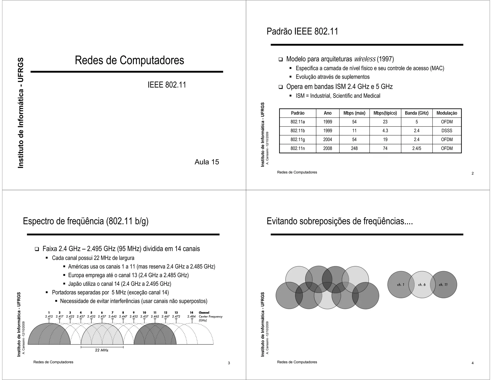 O documento descreve o padrão IEEE 802.11 para redes sem fio, especificando a camada física e o controle de acesso ao meio (MAC). Ele define os modos de operação distribuído e centralizado, as funções de controle de acesso DCF e PCF, além de detalhar os quadros, serviços, arquiteturas e espectro de frequência utilizado.