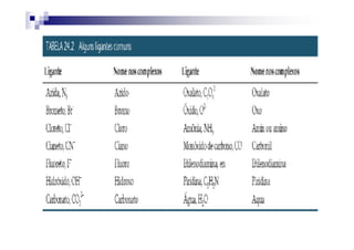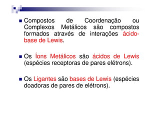 Este documento discute compostos de coordenação, que são formados por interações entre íons metálicos (ácidos de Lewis) e ligantes (bases de Lewis). Os complexos têm um íon metálico ligado a vários ligantes, e a cor do complexo depende do metal e seu estado de oxidação. A nomenclatura dos complexos descreve os ligantes e o metal.