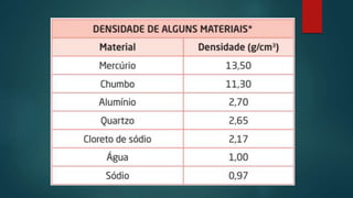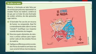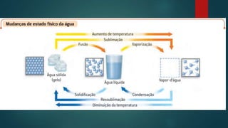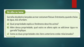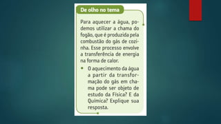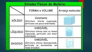 O documento discute os conceitos básicos de química e física da matéria. Explica que a química investiga as transformações e propriedades da matéria enquanto a física busca compreender como os fenômenos naturais interagem com a matéria. Descreve também as propriedades da matéria como massa, volume e densidade e como as partículas estão organizadas. Discutem-se os estados físicos da matéria e como a temperatura pode causar mudanças de estado como fusão, vaporização e sublim