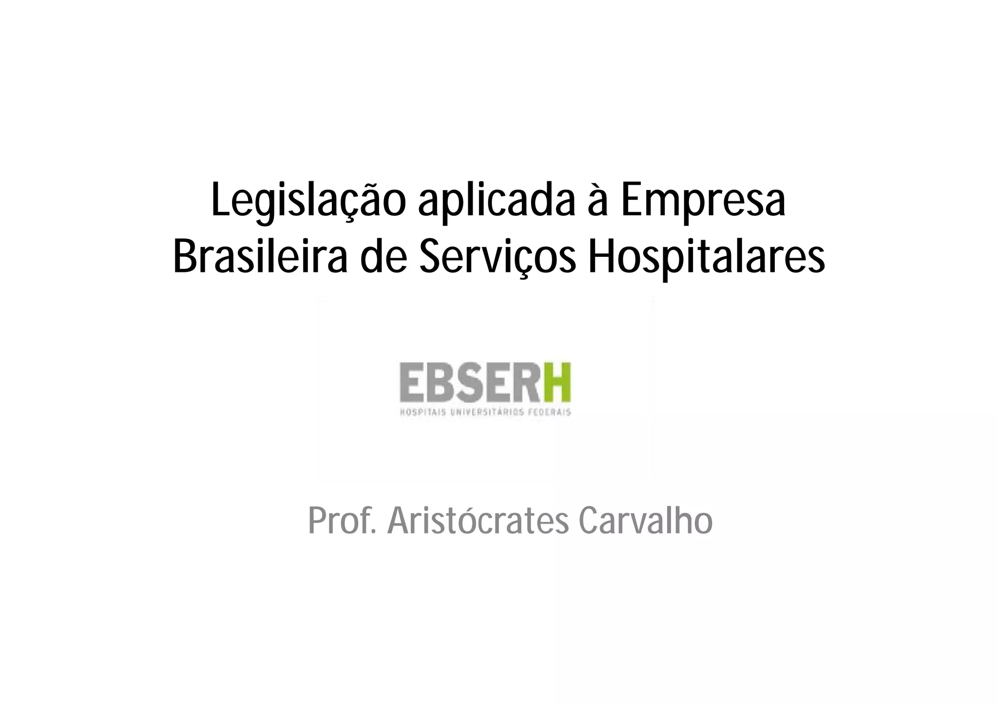 A EBSERH é responsável pela gestão de hospitais universitários federais mediante contratos. A legislação aplicada à EBSERH inclui a Lei 12.550/2011, que criou a empresa, e o Decreto 7.661/2011, que aprovou seu estatuto social. A EBSERH deve obedecer à legislação de licitações e contratação de pessoal, podendo celebrar contratos temporários por até 5 anos para implantação.