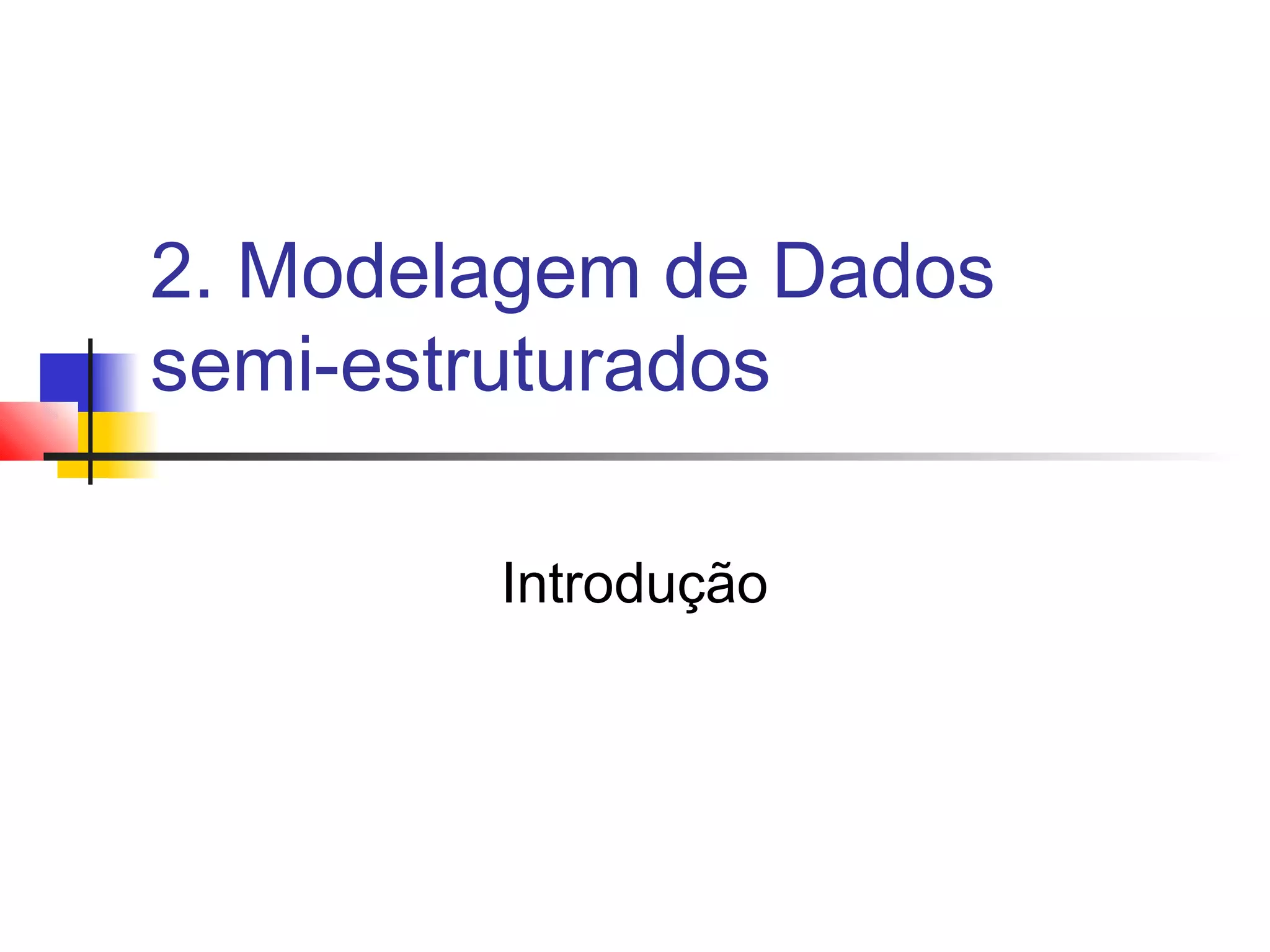 O documento discute a modelagem de dados semi-estruturados. Apresenta o que são dados semi-estruturados e como eles podem ser representados usando um modelo de grafo. Também descreve a evolução histórica dos sistemas de gerenciamento de dados semi-estruturados, incluindo projetos iniciais e a aceitação do XML pela indústria.