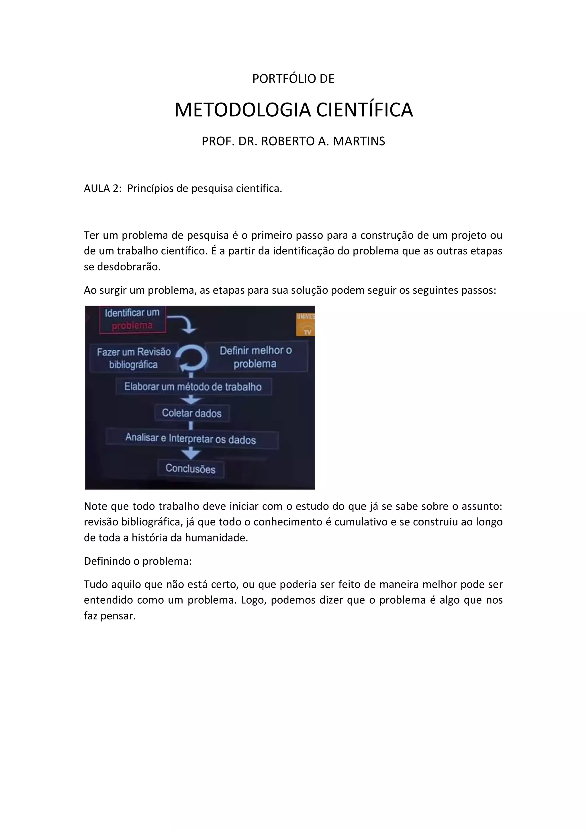 O documento discute os principais passos para realizar pesquisa científica, incluindo identificar um problema de pesquisa, revisar a literatura existente, definir o problema, criar estratégias para resolvê-lo com base em modelos existentes, propor teorias e hipóteses, e testá-las com dados e fatos.