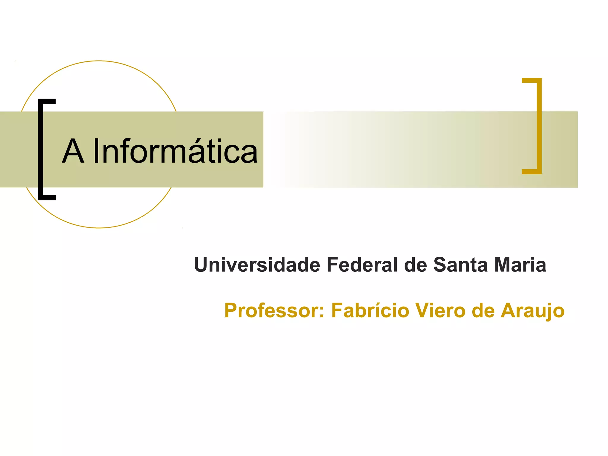 O documento apresenta uma introdução à informática ministrada pelo professor Fabrício Viero de Araujo. Aborda conceitos como computação, informação e computador, além de discutir as gerações de microcomputadores, dispositivos, partes que compõem o computador, software e sistemas operacionais.