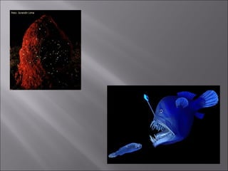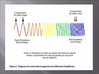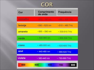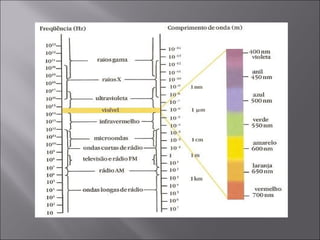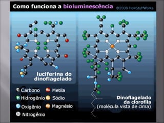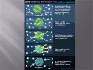 O documento discute processos físicos e biológicos relacionados à luz e energia. A fotossíntese converte energia luminosa em energia química através da clorofila em plantas. A bioluminescência converte energia química em luz visível através de reações envolvendo luciferinas em alguns organismos.