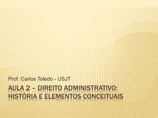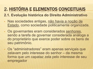 O documento descreve a evolução histórica do Direito Administrativo desde sociedades antigas até a formação do Estado moderno, destacando a transição do absolutismo para o Estado de Direito no século XVIII. Também define Direito Administrativo como o conjunto de normas que regem a atuação da Administração Pública e explica suas principais fontes.