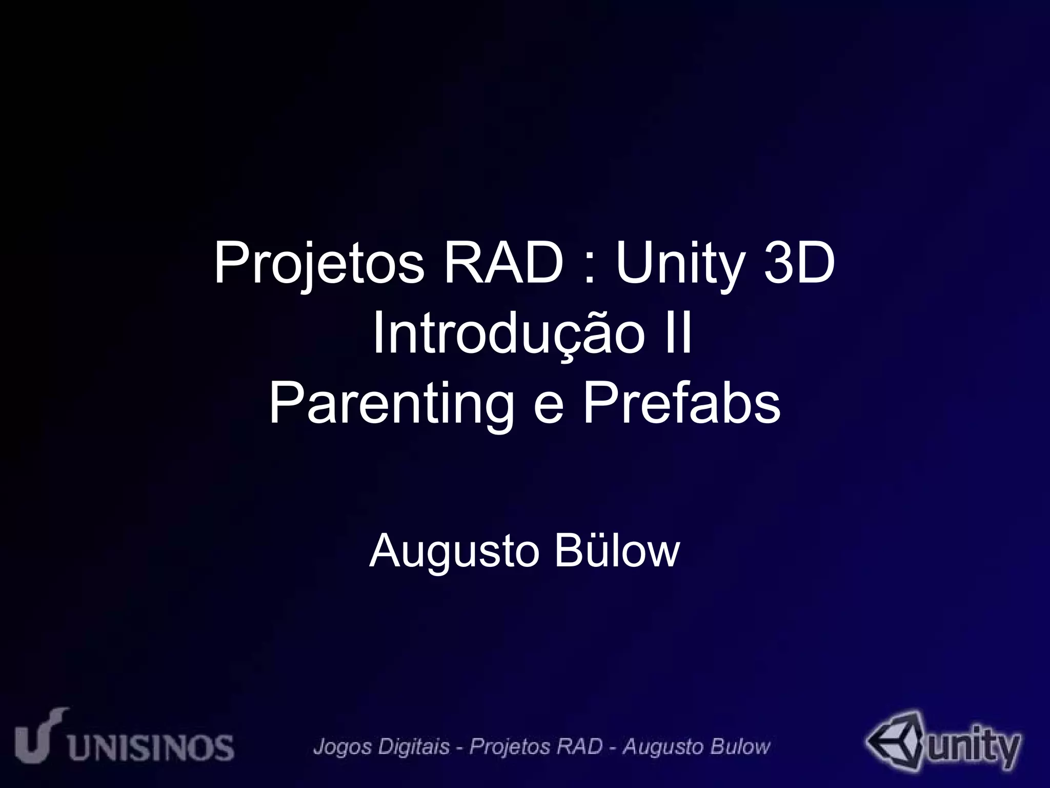 O documento discute conceitos importantes em Unity 3D como Parenting e Prefabs. Parenting permite agrupar objetos de forma que as alterações no objeto principal (Parent) afetem os objetos relacionados (Childs). Já os Prefabs permitem a criação de objetos complexos reutilizáveis, de modo que alterações no Prefab se aplicam a todas as suas instâncias. O documento fornece exemplos práticos destes conceitos para facilitar a compreensão.