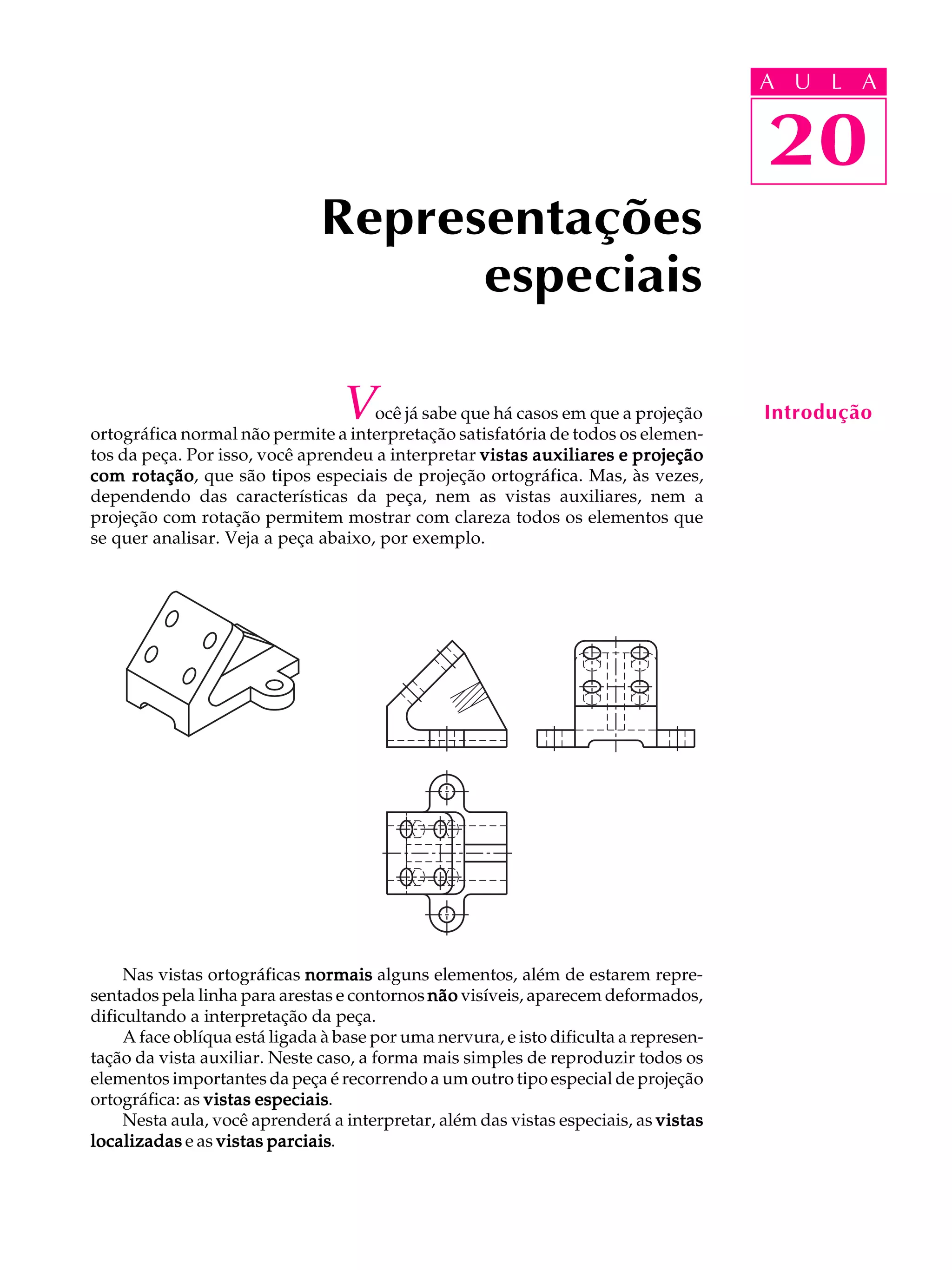 O documento discute diferentes tipos de representações gráficas de peças em desenho técnico, incluindo vistas especiais, vistas localizadas e vistas parciais. Explica como essas representações permitem mostrar com clareza elementos da peça que não ficam claros em vistas normais, como faces oblíquas ou elementos simétricos, de forma mais simples e econômica.