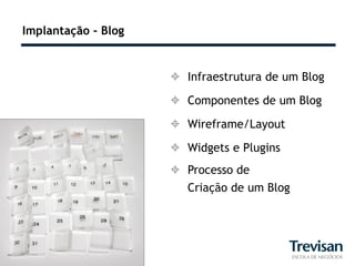 O documento discute a implantação de um blog, abordando os seguintes tópicos: 1) infraestrutura e componentes de um blog; 2) uso de logotipo e marca em blogs; 3) wireframes e layouts comuns em blogs com WordPress.