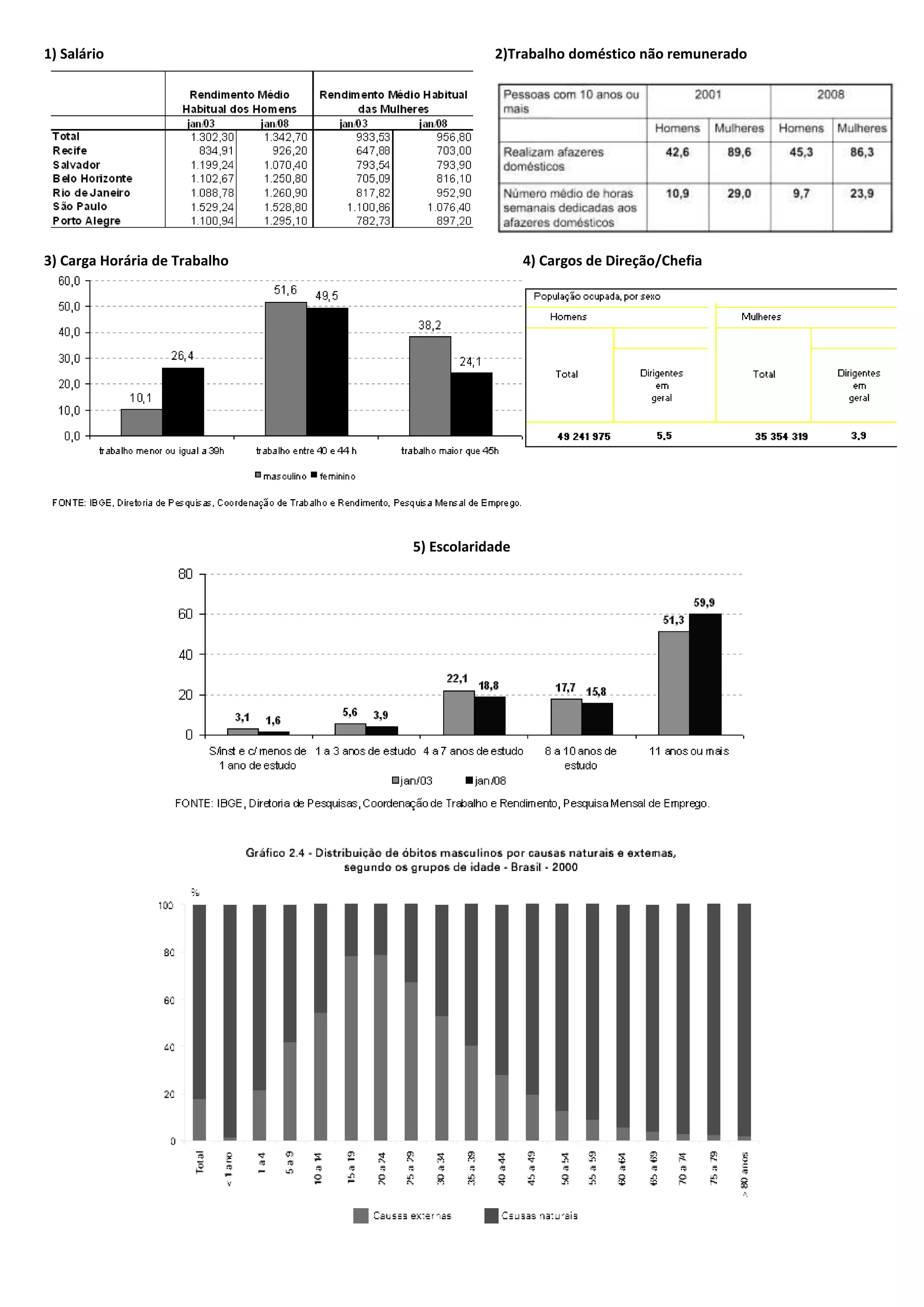O documento discute 5 tópicos principais: 1) salário e remuneração, 2) trabalho doméstico, 3) carga horária, 4) cargos de liderança e 5) escolaridade.