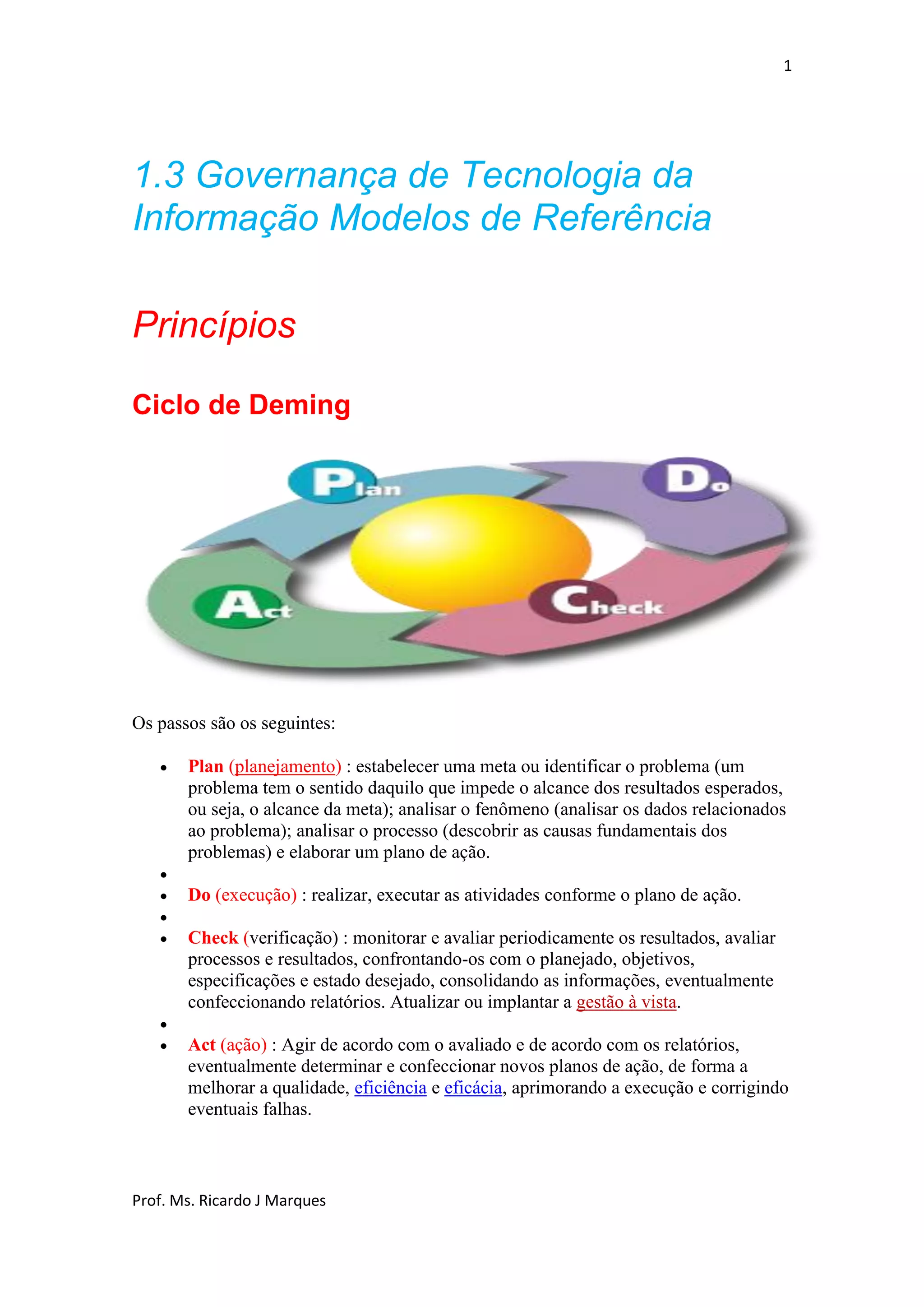 O documento discute modelos de referência para governança de tecnologia da informação, incluindo o Ciclo de Deming, COBIT e ITIL. Também aborda indicadores de desempenho como KPIs e critérios para definí-los. Por fim, apresenta exemplos de como sistemas de informação podem quebrar barreiras de tempo, espaço e custos em empresas.