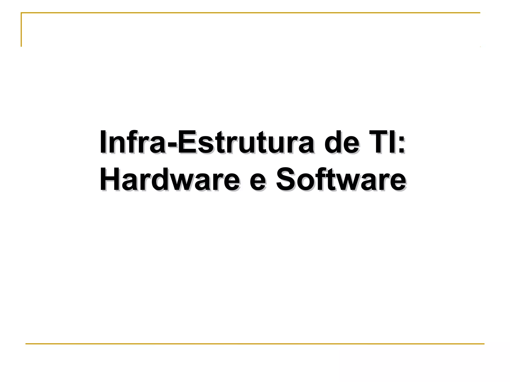 O documento descreve os principais componentes da infraestrutura de TI, incluindo hardware como processadores, memória e periféricos, e software como sistemas operacionais e aplicativos. Ele também discute a estrutura computacional básica e os tipos de computadores, com foco na arquitetura central de processamento, memória e comunicação de dados.