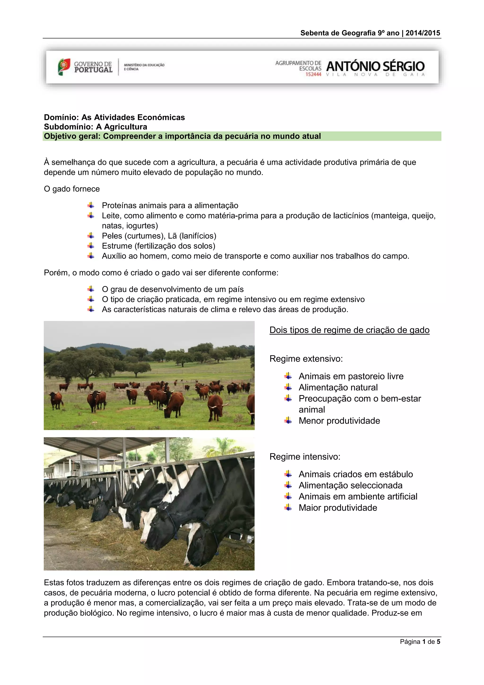 O documento aborda a importância da pecuária e sua relação com a agricultura, destacando diferentes modos de criação (extensivo e intensivo) e seus impactos ambientais. Aponta a criação de gado como uma das principais causas do aquecimento global e os desafios futuros para a produção agrícola frente ao crescimento populacional. Além disso, propõe práticas sustentáveis como a integração lavoura-pecuária-floresta para melhorar a eficiência produtiva e reduzir danos ao meio ambiente.