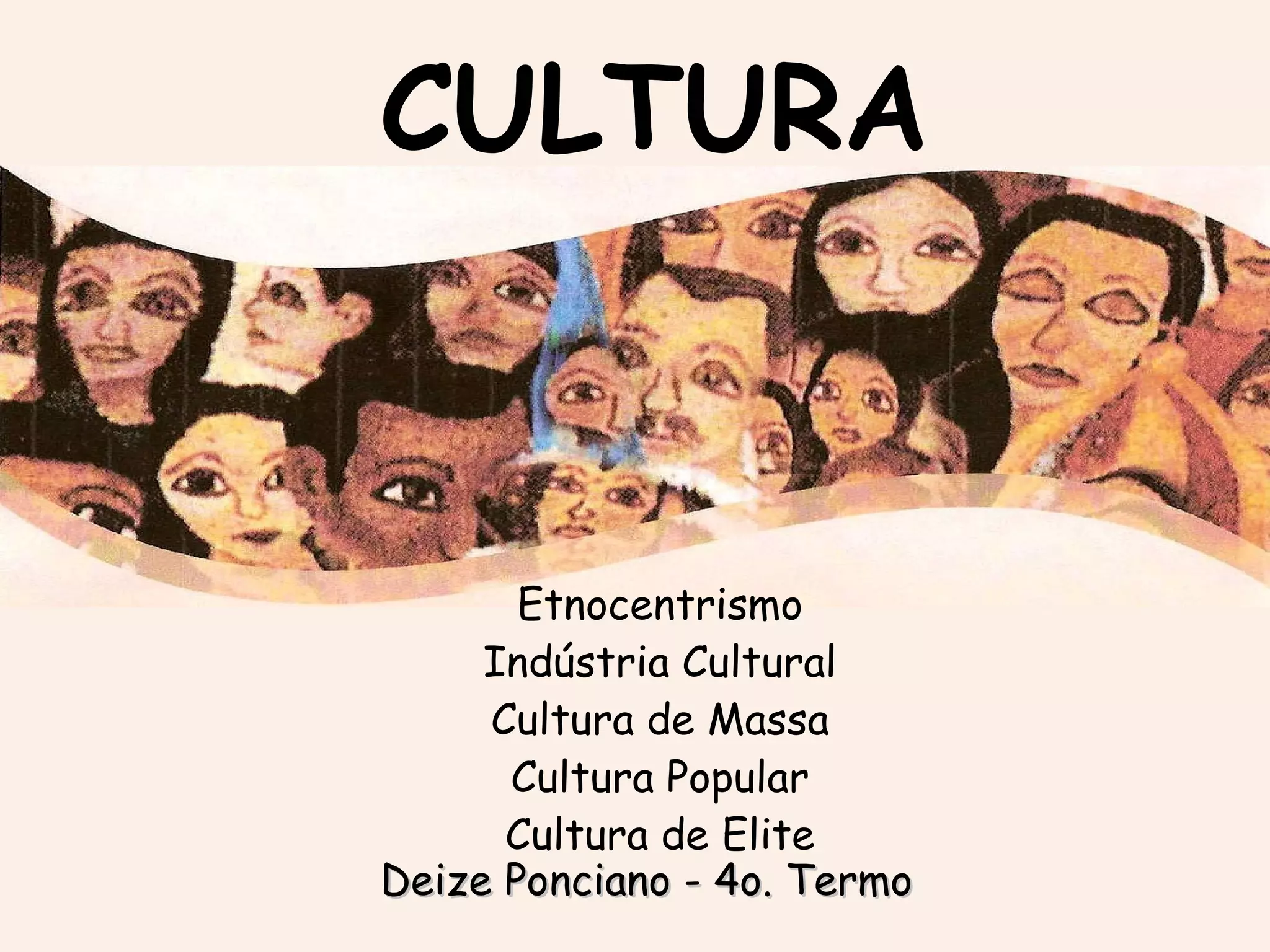 O documento discute os conceitos de etnocentrismo, cultura de massa, cultura popular e cultura de elite. Explica que o etnocentrismo envolve ver a própria cultura como superior e julgar outras culturas por seus próprios padrões. A cultura de massa é moldada pela indústria cultural para disseminar a ideologia da classe dominante. Já a cultura popular é aquela construída pelo povo, preservando sua essência. A cultura de elite é aquela imposta e regulada pela classe dominante.