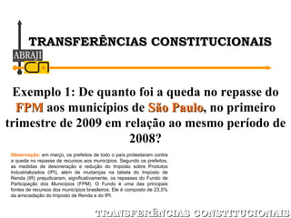 O documento discute as transferências constitucionais da União para estados, Distrito Federal e municípios. São parcelas de recursos arrecadados pela União que são repassados por determinação da Constituição, como o Fundo de Participação dos Municípios. O texto exemplifica como verificar a queda nos repasses do FPM para municípios de São Paulo entre 2008-2009 e da Cide para Minas Gerais no mesmo período.
