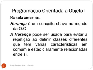 O documento discute os conceitos fundamentais de programação orientada a objetos, incluindo herança, polimorfismo, atributos, métodos, tipos de dados, variáveis, constantes e operadores aritméticos. Também apresenta a estrutura básica de um programa C#, como namespaces, classes e métodos.